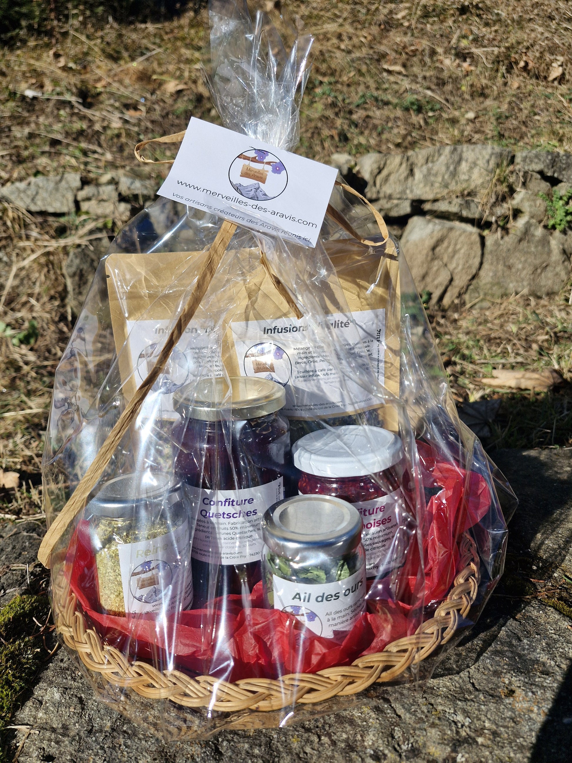 Panier garni composé de 2 infusions, 1 confiture 250 gr, 1 confiture 430 gr, 1 flocon d'ail des ours 6 gr, 1 reine des prés 15 gr, 1 corbeille en osier.